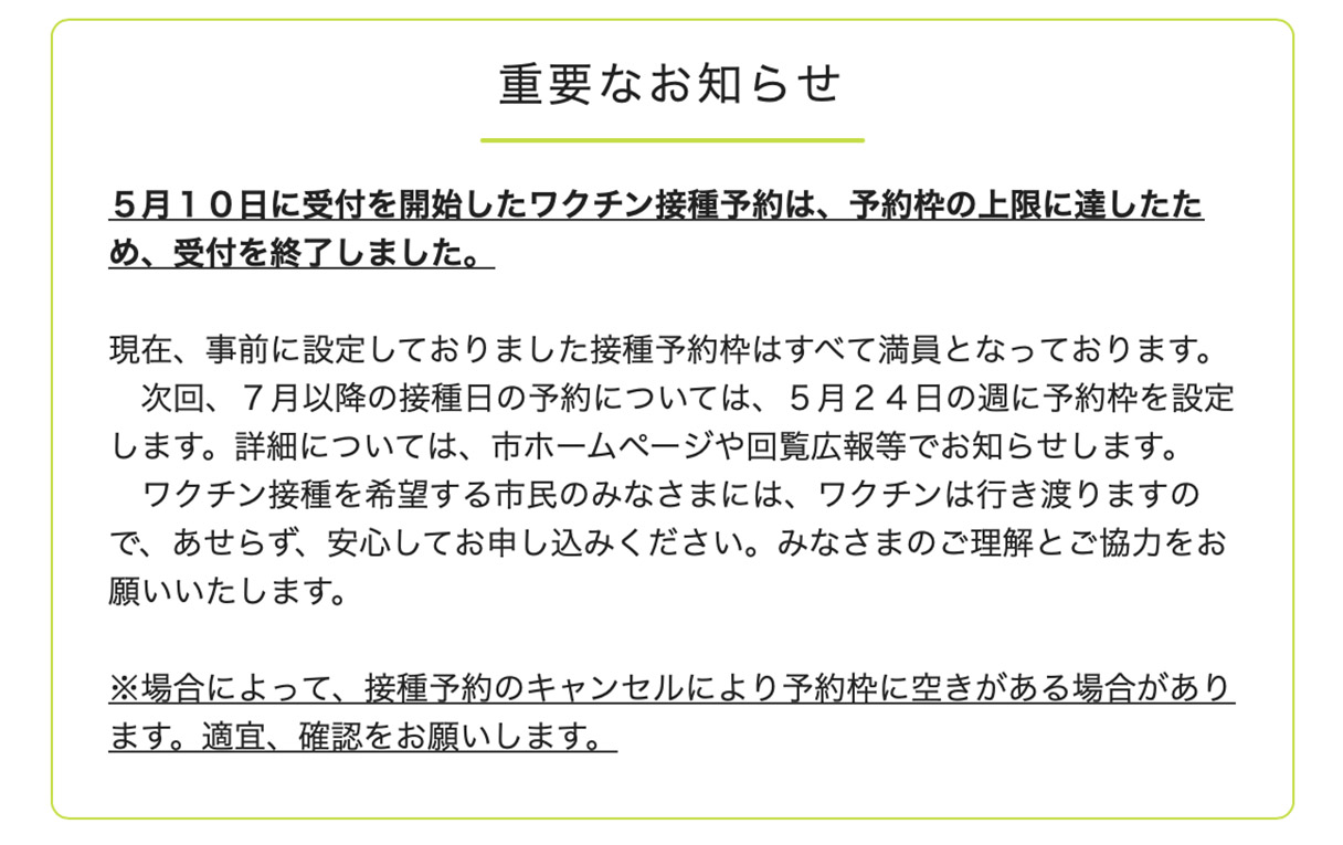 市ホームページに掲載されたワクチン予約に関するメッセージ