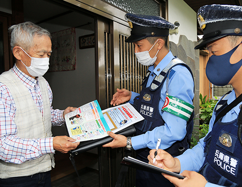 この日は姫路署から派遣された警察官18人がペアになって一世帯ずつ戸別訪問。防犯ちらしと代表的な詐欺の手口をまとめたパンフレットを配り、「お金の話が出たら詐欺。怪しいと思えば、誰かに相談するか警察に通報して」と呼び掛けた。