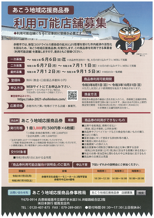 申し込み、問い合わせは「あこう地域応援商品券事務局」Tel079・281・1363(日本旅行姫路支店内、土日祝を除く午前9時半〜午後5時半)。専用サイトはhttps://ako-2021-shohinken.com