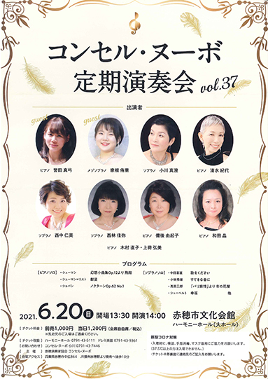 赤穂市内在住、出身の音楽大学卒業者によるコンサート。声楽、ピアノなど客演を含め10人が出演する。