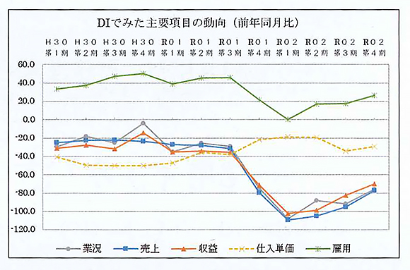 市内119事業所を対象に売上動向を調査。「増加・好転」と回答した割合から「減少・悪化」と答えた割合を引いた数値が売上DIとなる。新型コロナウイルス感染拡大による最初の緊急事態宣言が発令された2020年4〜6月期に過去最悪のマイナス109・3を記録。その後は回復傾向にあり、今回の数値は1年前(マイナス79・5)の水準に戻った。