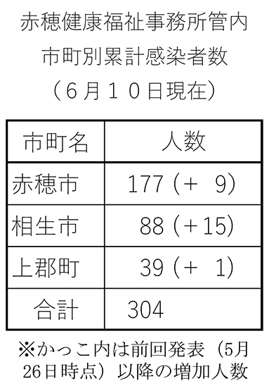 相生市は88人(15人増)、上郡町は39人(1人増)。赤穂健康福祉事務所管内全体では304人となった。各市町の直近の人口では、赤穂市は261人に1人、相生市は325人に1人、上郡町は370人に1人が新型コロナに感染した計算になる。