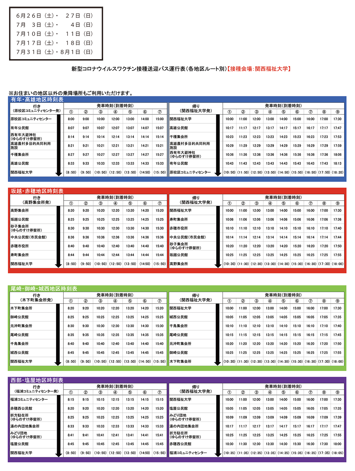 運行表(6月26日、27日、7月3日、4日、10日、11日、17日、18日、31日、8月1日)接種会場:関西福祉大学