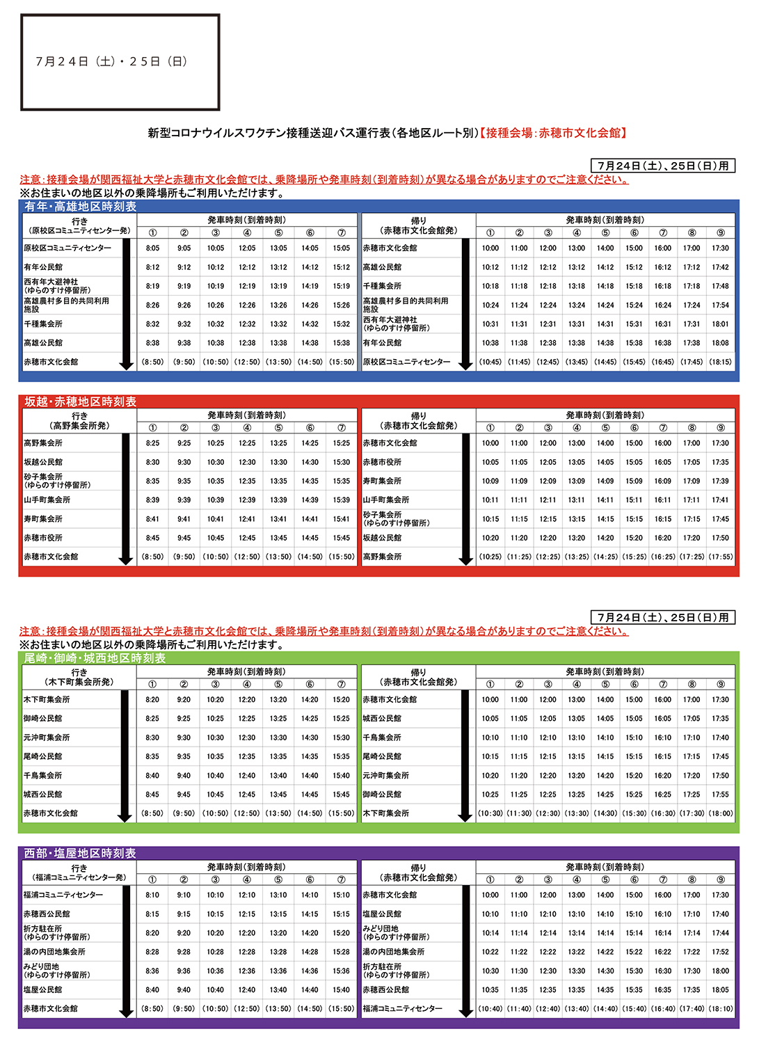 したがって、運行ダイヤとしては、接種会場が「関西福祉大学」(6月26日、27日、7月3日、4日、10日、11日、17日、18日、31日、8月1日)のものと「赤穂市文化会館」(7月24日、25日)のものと2種類です。赤穂民報ホームページでは2種類にまとめて掲出しました。(2021年6月19日12時25分)