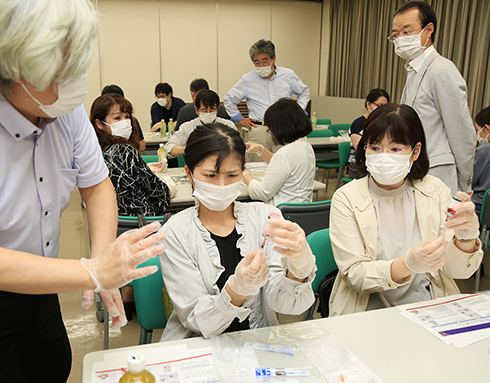 「急な要請だったにもかかわらず、多くの会員が薬剤師としての使命感をもって協力を申し出てくれた」と寺田晋一郎会長(66)。すでに全員がワクチン2回接種を終えており、研修に参加した小西恭子さん(53)=中広=は「地域に貢献できるよう頑張ろうという気持ちです」と意欲を語った。