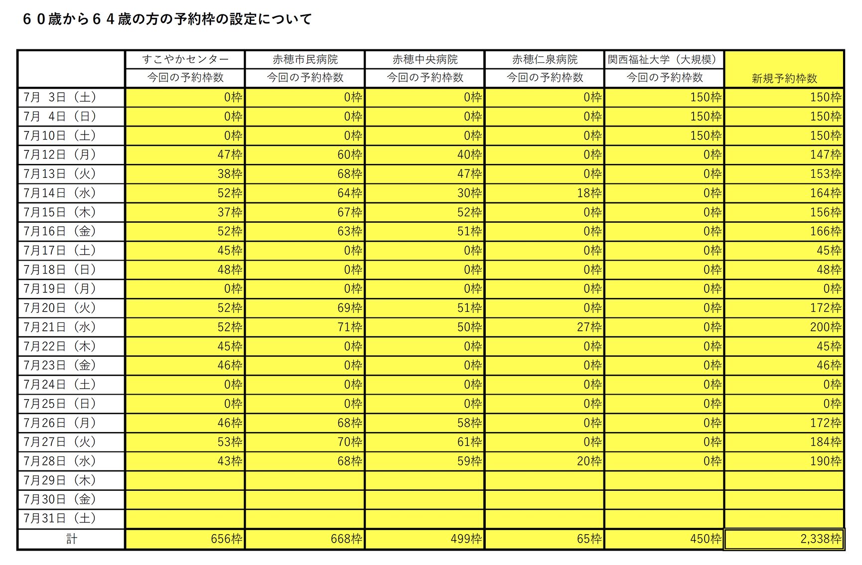 1日から予約を受け付けるのは、7月3日(土)から28日(水)までに集団接種会場(すこやかセンター、赤穂市民病院、赤穂中央病院、赤穂仁泉病院)と大規模接種会場(関西福祉大学)の計5会場で実施する2338枠。ライン、ウェブ、コールセンターへの電話で受け付ける(関西福祉大学の7月3日分は電話予約のみ、4日分は2日以降は電話予約のみとなる)。