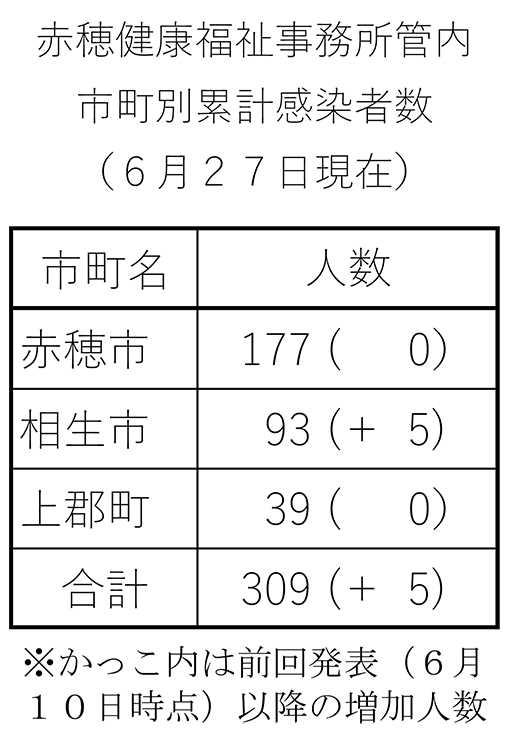 上郡町も39人で前回から変わらず、相生市は93人で5人増えた。赤穂健康福祉事務所管内では6月15日以降、陽性者は確認されていない。