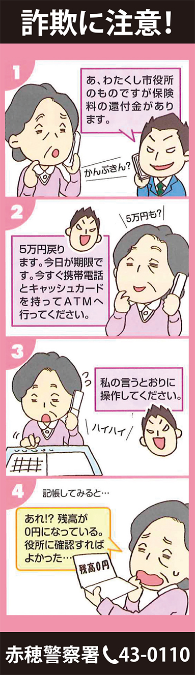 同署は「保険料の還付があるといってATMを操作させるのは絶対に詐欺。警察に相談してください」と注意を呼び掛けている。