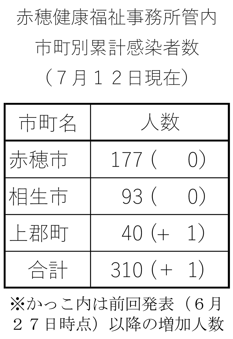 相生市は93人で前回から変わらず、上郡町は1人増えて40人。赤穂健康福祉事務所管内の合計は310人となった。