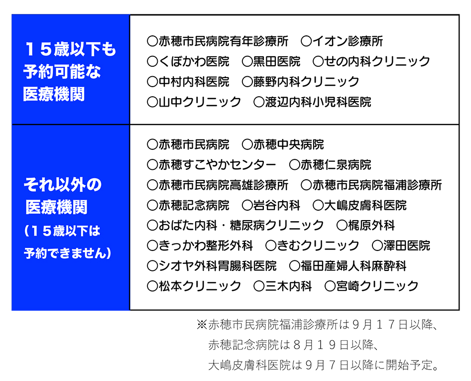予約ページの表記について、赤穂市から「15歳未満」ではなく、「15歳以下」と訂正がありました。(2021年7月28日10時30分)
