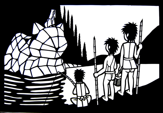 夏の日の午後のことです。猫岩の上に見たこともない女の人が、頭に白い布をかぶり、白い着物を着てうずくまり、異様な目つきで、じっと子どもたちの方を見ているのです。