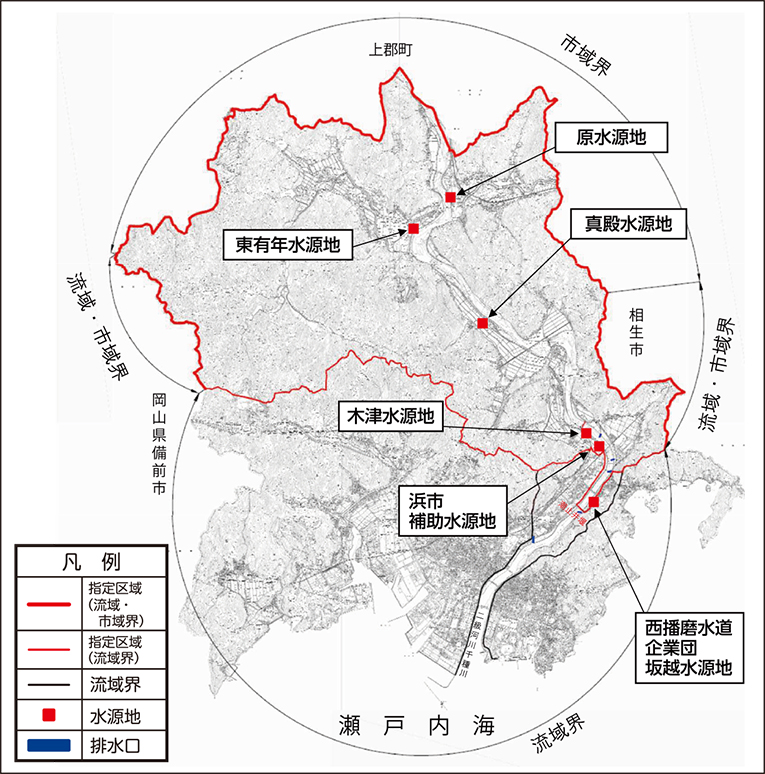 今年4月に施行された赤穂市水道水源保護条例では、千種川水系の保全涵養と水質汚濁防止を目的に水源保護地域での対象事業(廃棄物処理や一定規模以上の造成など)によって水質汚濁や水源を枯渇させるおそれのある行為を禁止。対象事業を行おうとする事業者に事前の届け出を義務付け、条例に反した事業者に対し改善や中止を命じる権限を市長に認めている。水源保護地域の範囲は有識者らによる審議会の意見を聴いた上で市長が指定できる。