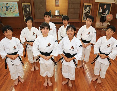 少林寺拳法の全国中学生大会に出場する=女子左から=阿賀心美、松林優有さん、=男子左から=松林旺良、山崎結叶、有吉優人、大崎颯真、今田颯樹、田中宙頼君