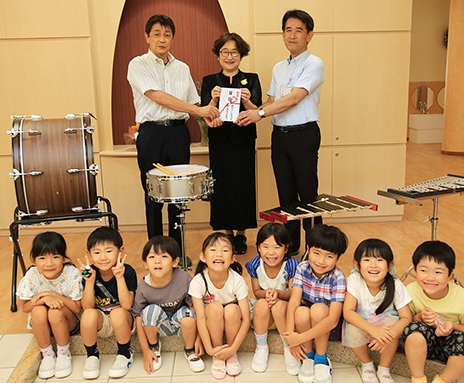 寄贈式で濱口雅子園長は「今まで使用していたものよりも立派な楽器を寄贈いただいてありがたい。音楽会など園の行事で活用したい」と感謝。自身も同園の卒園生という関社長は「天真爛漫な笑顔を見せてくれる子どもたちが伸び伸びと成長することを楽しみにしています」とあいさつした。