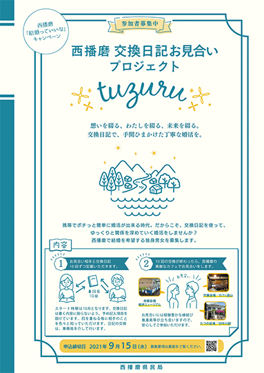日記帳を受け取ってから5日以内に記入・返送できることなどを条件に20〜45歳くらいの独身男女各10人を募集する。男性は西播磨在住、または結婚後に居住予定の人を対象。