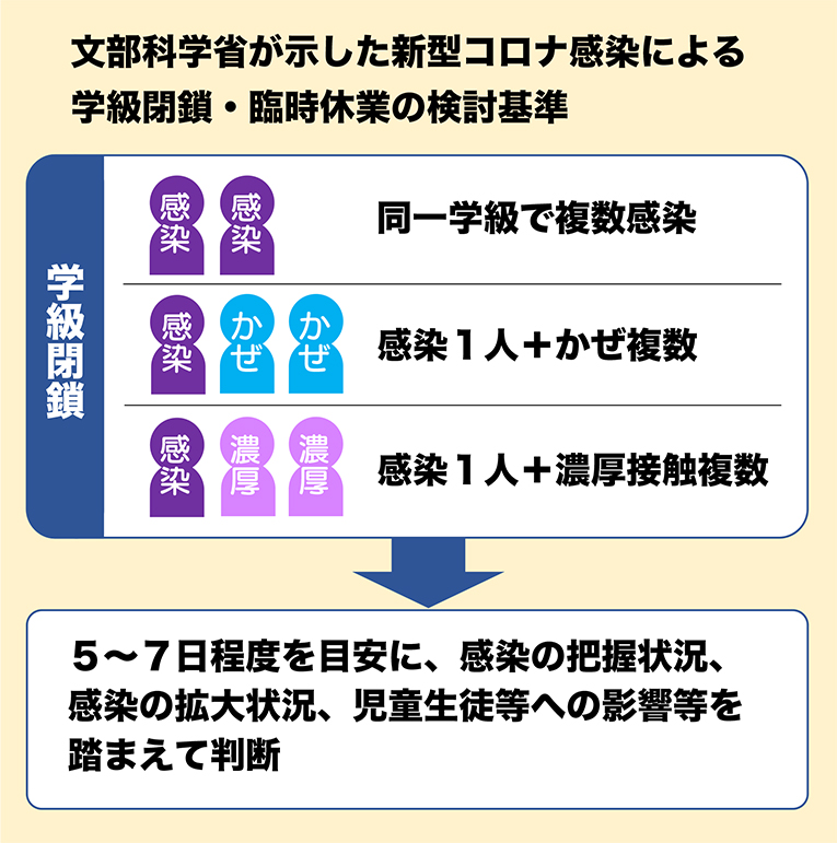 国が先月27日に発表したガイドラインでは、学級閉鎖を検討する目安として、▽同一学級で複数の感染が判明▽感染者が1人でも周囲に未診断の風邪などの症状が複数人▽1人が感染し、複数の濃厚接触者があるーなどとし、学級閉鎖の期間を「5〜7日程度を目安」としている。ただし、すでに基準を設けている場合はそのまま運用しても構わないという。