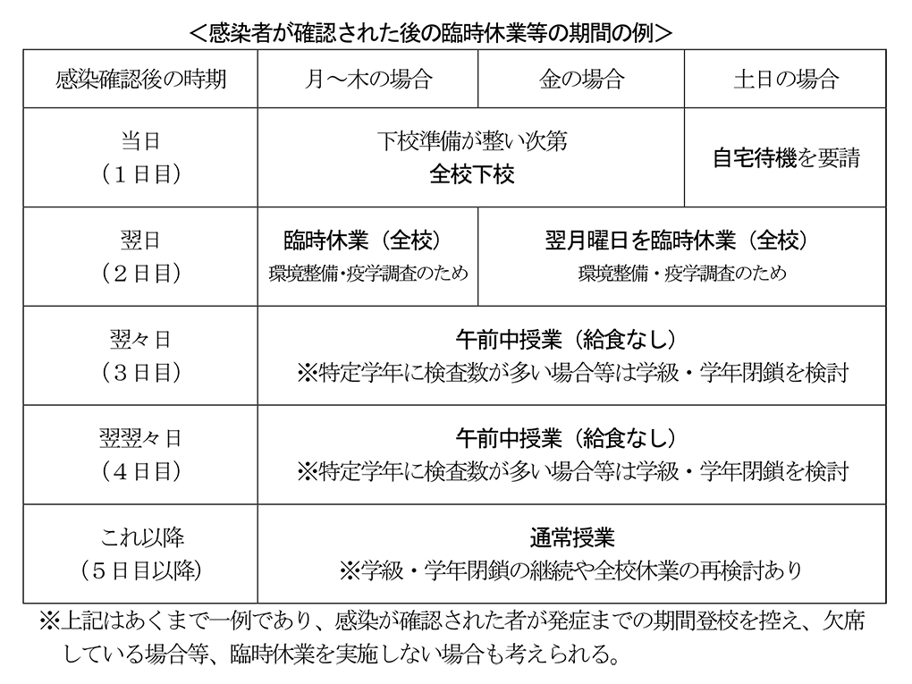 ガイドラインによると、学校関係者に感染が確認された場合、該当校の児童生徒を速やかに一斉下校させる。土日の場合は自宅待機を要請する。翌日(感染確認日が金土日の場合は週明けの月曜日)は環境整備と疫学調査のため全学年で臨時休業。翌々日から2日間は給食を実施せず午前中で授業を切り上げ、感染確認5日目から通常授業を再開する。ただし、感染拡大状況に応じて学級・学年閉鎖や全校休業を検討する。