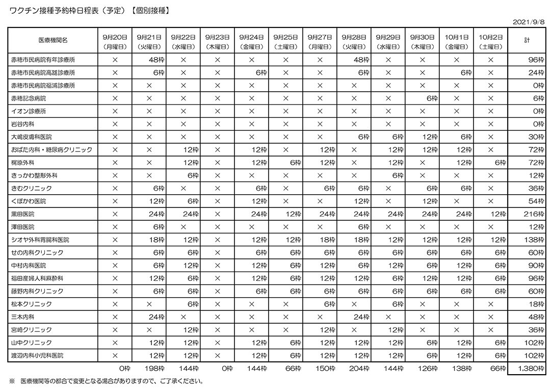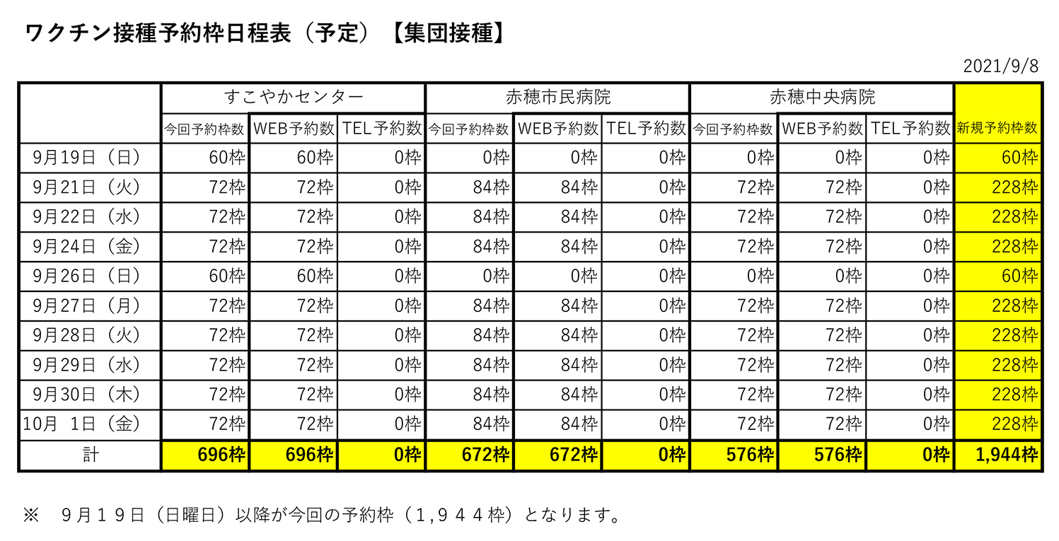第9次募集となる今回は9月19日(日)から10月2日(土)までの12日間で3324枠(集団接種1944枠、個別接種1380枠)の予約枠を設けた。
