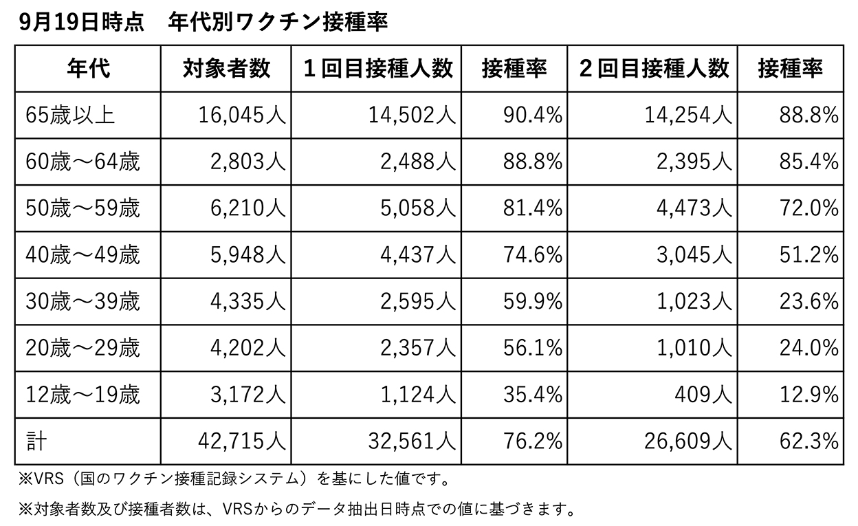 全世代(12歳以上)では対象者数4万2715人のうち62・3%にあたる2万6609人が2回接種を終えている。