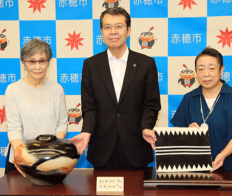 市制施行70周年を記念して寄贈された赤穂雲火焼と赤穂緞通