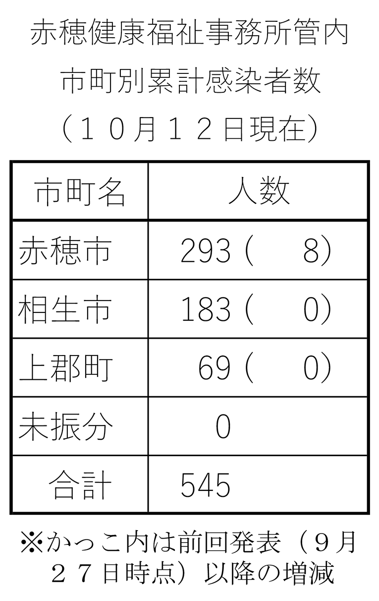 赤穂市居住の陽性者数は293人。前回発表時点では居住市町が振り分けられていなかった6人と前回発表以降に陽性が確認された2人が加わった。相生市と上郡町は増加がなかった。