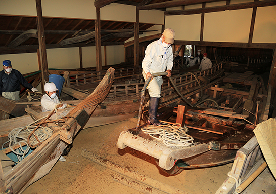 一年に一度も海水に浸からなければ船が乾燥して劣化が進むことから、保存会の役員ら十数人が船倉のある生島に漁船で渡り、ポンプで汲み上げた海水を各船内に注入。2〜3週間ほど海水を張った状態にすることで木材を適度に保湿できるという。