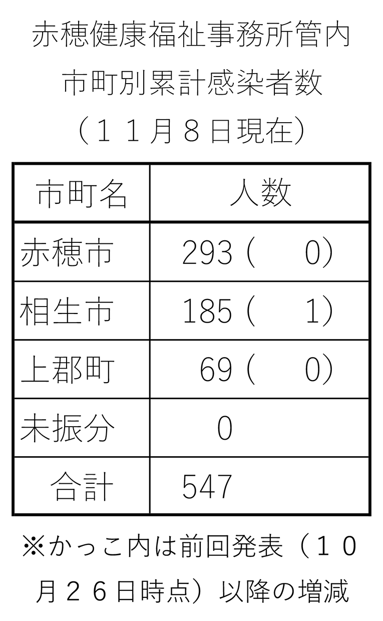市町別では、相生市が1人増えて185人。赤穂市は293人で10月12日時点から変わらず、上郡町は69人で9月27日時点から増えていない。