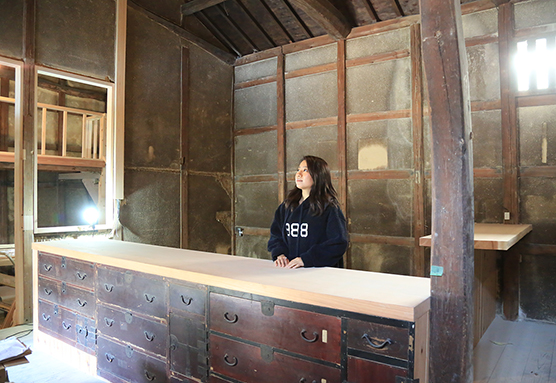 市街地景観重要建築物をフリースペースやカフェとして再生しようと取り組む濱尾萌夏さん。手前は古箪笥をリメイクしたカウンター