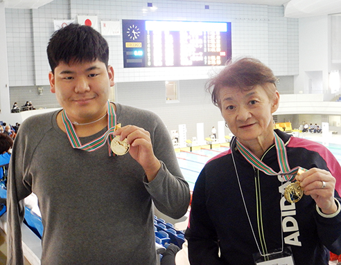 日本パラ水泳選手権で大会新記録を樹立して3連覇した古川修哉さん(左)と4大会連続優勝の吉川真澄さん=光都SC提供
