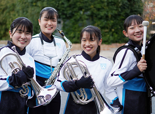 部員60人のうち、2年の金谷美憂さん(メロフォン)と出口楓さん(アルトサックス)、1年の金谷美玲さん(バリトン)と大河優月さん(ベースドラム)が赤穂市出身。4人ともマーチングバンド活動に興味を持って同校へ進学したという。