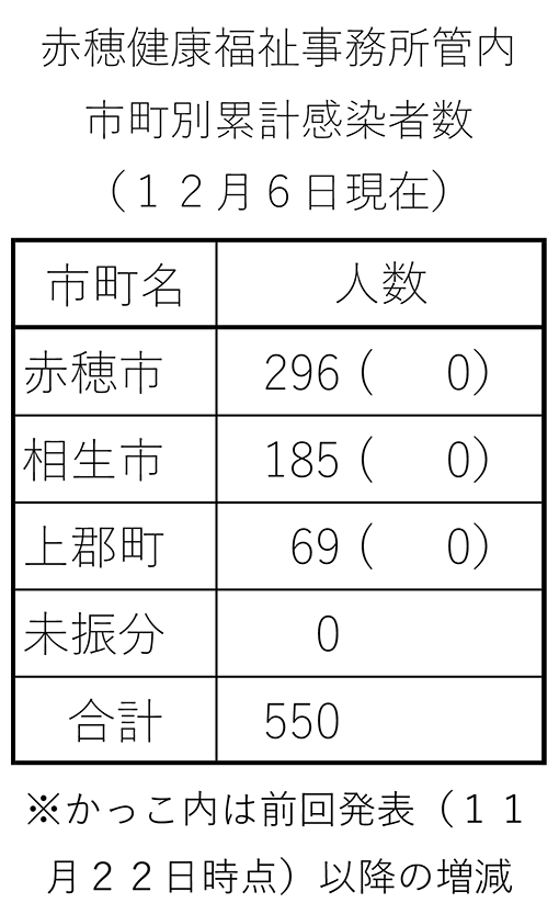 市町別の内訳は、赤穂市296人、相生市185人、上郡町69人。