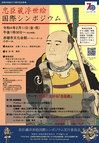 赤穂市制70周年記念事業として実行委員会が主催する。研究者による基調講演と個別発表、パネルディスカッションの3部構成。忠臣蔵浮世絵の変遷や特徴を紹介しながら、赤穂市が開設している忠臣蔵浮世絵データベースの意義と活用の方向性を論じる。