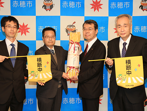 「マイカー共済」の見積もり1件につき1本の横断旗を学校や児童館などへ贈る全国的な取り組みで、赤穂市への寄贈は初めて。