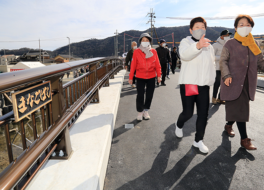 県光都土木事務所によると、道路との接合部などの付帯工事が完了するまでは数メートル下流の仮設橋を併用し、今年3月末までの完全供用を目指す。
