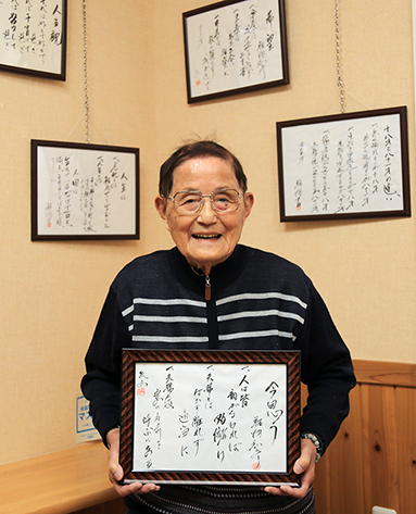 高野の難波和彦さん(95)が約15点を出品。「長生きはリズム正しく日々送る」「人は皆病がなければ丸儲け」など日々の暮らしの中で感じたことを率直に筆でつづっている。谷内村(現姫路市飾東町)の村長で文化人だった父・輝二さんの影響で若いころから俳句や謡曲をたしなんだ。書作品には父から受け継いだ「漣亭孤舟(さざなみていこしゅう)」と号す。