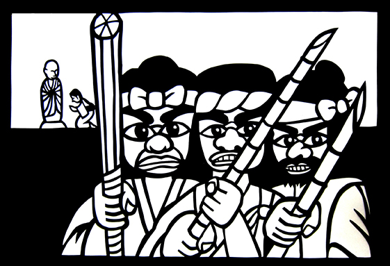 すると悪党たちは、村人が稲を刈ろうと思っている前に村をおそい、稲を刈り取って帰るようになりました。ついに村人は、竹槍や棒切れをもって、夜も警戒にあたるようになりました。