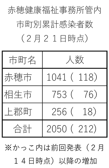 赤穂市の累計感染者数は前回発表時(2月14日時点)の923人から118人増えた。相生市は753人(76人増)、上郡町は256人(18人増)で、赤穂健康福祉事務所管内全体では2050人(212人増)となった。