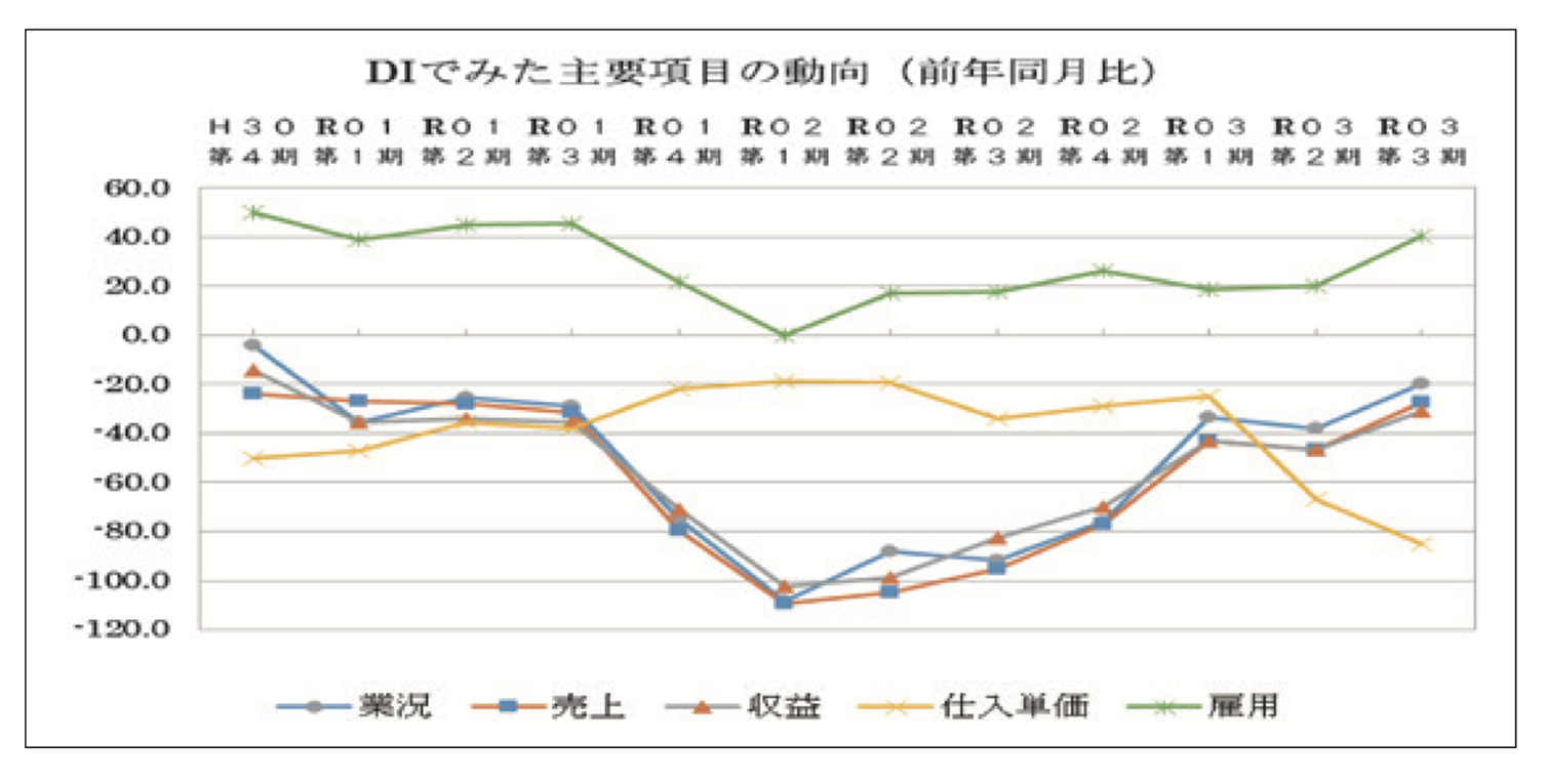 調査結果によると、売上DIはマイナス27・6で前期から18・8ポイント改善。産業別では建設業とサービス業が改善した一方、製造業と卸売業、小売業、不動産・運輸業は悪化した。仕入単価DIはマイナス66・7だった前期から18・4ポイント悪化してマイナス85・1となった。