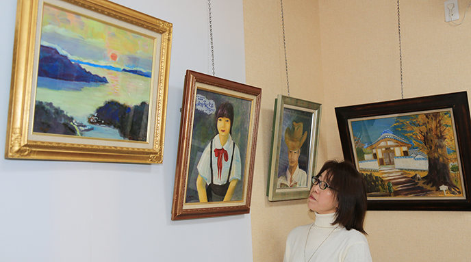 坂越湾など地元の風景を題材にした作品や家族を描いた人物画など11点を展示。今江さんは「作品を通して生前の父を思い出してもらえたらありがたい」と話している。
