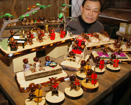 材料の実はハイキングに出かけたときなどに調達する。頭、胴体、手足にしっぽ。1体につき7個の実を針金でつなぐ。仕上げに塗った工芸用うるしが表面を生き生きと輝かせている。