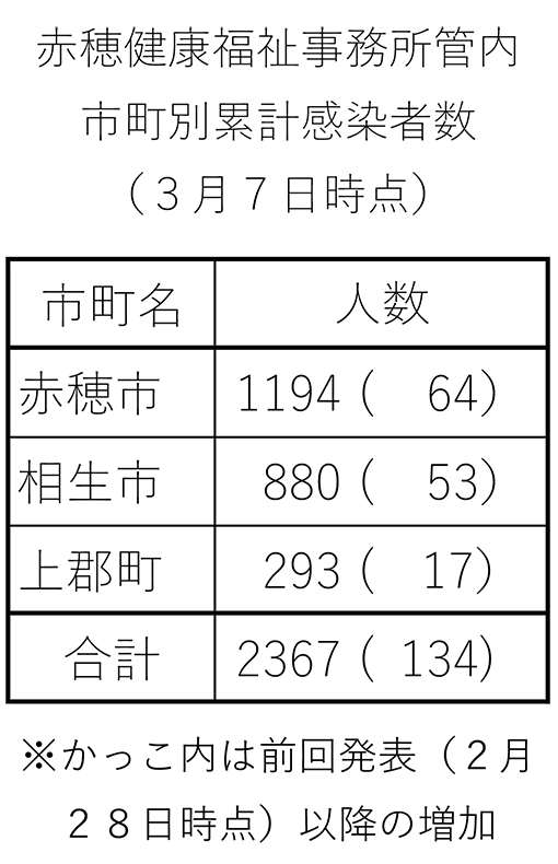 また、県内市町別の2020年3月5日以降の累計感染者数を更新し、3月7日時点で赤穂市は1194人(前週比64人増)、相生市は880人(53人増)、上郡町は293人(17人増)となった。