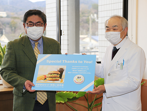 特別招待券は兵庫県内のマクドナルドでセットメニューを注文できる。代表して招待券を受け取った赤穂はくほう会病院の三好新一郎院長は「職員のモチベーションにつながる。さっそくスタッフに配りたい」と感謝を述べ、櫛田社長は「大変なご苦労があると思いますが、これからも地域の医療を守るために頑張ってください」とエールを送った。
