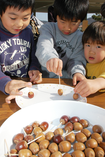 昔遊びを手軽に楽しんでもらおうと、昨年に続いて2回目。ドングリは昨秋、公園内で実ったものを使用した。