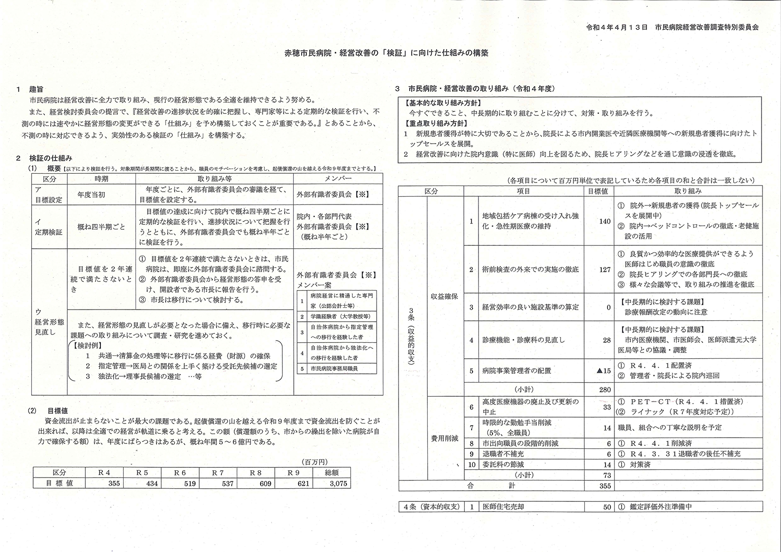 同日に市議会が開いた市民病院経営改善調査特別委員会(釣昭彦委員長)で示された資料によると、今年1月に経営検討委員会から提案を受けた経営改善策に基づき、起債償還の山を越える2027年度までの6年間で総額30億7500万円の収支改善を図ろうと、単年度ごとに3億5500万円〜6億2100万円の目標値を設定。2年続けて目標をクリアできない場合は、今後新たに設ける外部有識者委員会に経営形態見直しを諮問する。