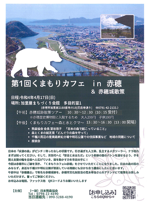 クマをシンボルに奥山水源の森の保全・再生や大型野生動物の保護にボランティアで取り組む実践自然保護団体「日本熊森協会」が主催。室谷悠子会長が「日本の森で起こっていること」と題して講演するほか、千種川流域の産廃処分場建設計画など地域の問題についても話し合う。
