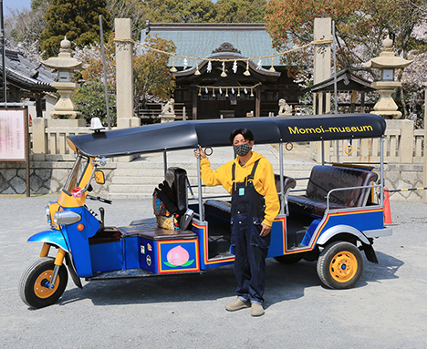 桃井ミュージアムへの無料送迎で爽やかなドライブが好評のトゥクトゥク。後方は伊和都比売神社