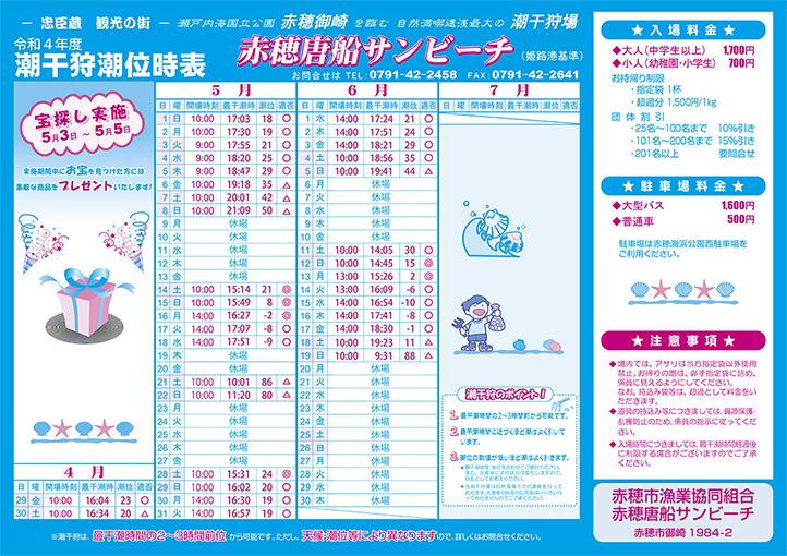 潮干狩りに適した時間帯を示す潮位時表は赤穂市漁協のホームページで見ることができる。問い合わせはTel42・2458、ファクス42・2641。
