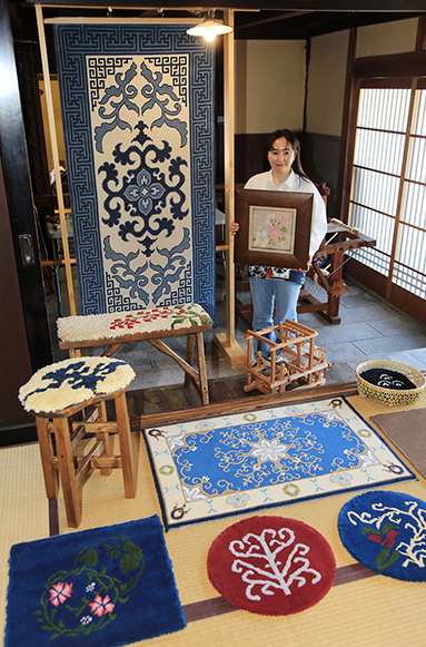 伝統的な一畳敷から、ものづくり作家とのコラボ作品まで多彩に並ぶ「〜暮らしに生きる伝統と新しいかたち〜赤穂緞通工房 結ーゆうーなおこ展」が5月4日(水・祝)から姫路市南町の山陽百貨店本館5階美術画廊で開かれる。