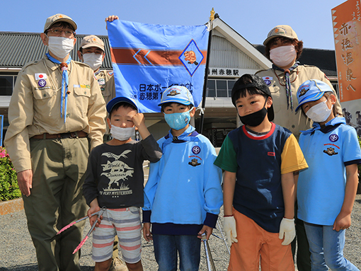 8日にJR播州赤穂駅から赤穂大石神社にかけて行った清掃奉仕活動には新入隊員3人と見学者1人が参加。カブスカウト隊やボーイスカウト隊の先輩隊員らとともに道に落ちた空き缶やペットボトルなどを拾った。