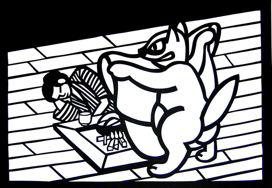 旅人が寝てしまったのを見届けた老人は自分の金玉袋を引っ張り出しました。一畳、二畳、三畳……七畳と広がり、八畳の広さになると、バサッと旅人にかぶせて包み込んでしまいました。金玉袋が元の形に戻ったときには旅人の姿はありませんでした。